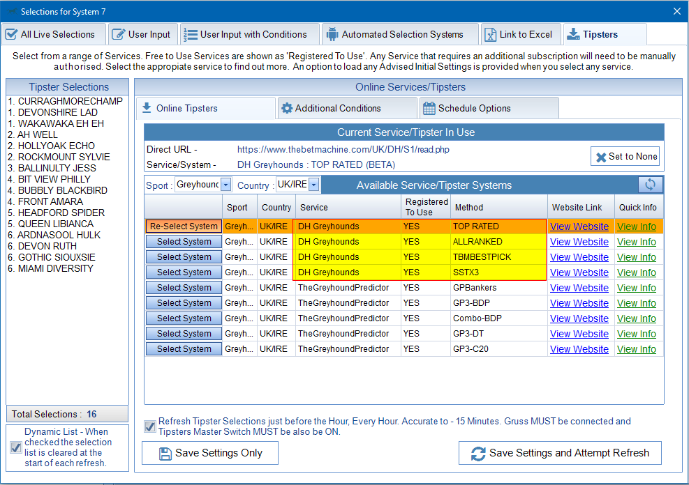 Each selection system can be found via the View Series/Settings –> Selections –> Tipsters for each for each of your individual systems in TBM.