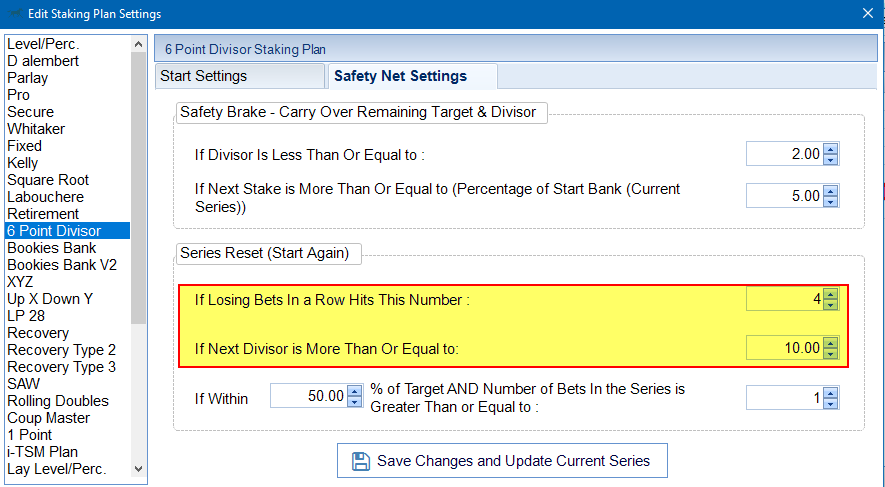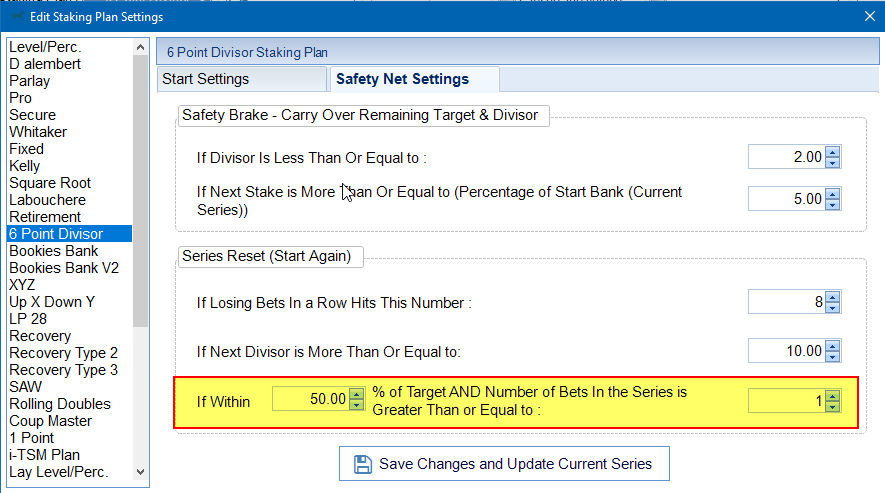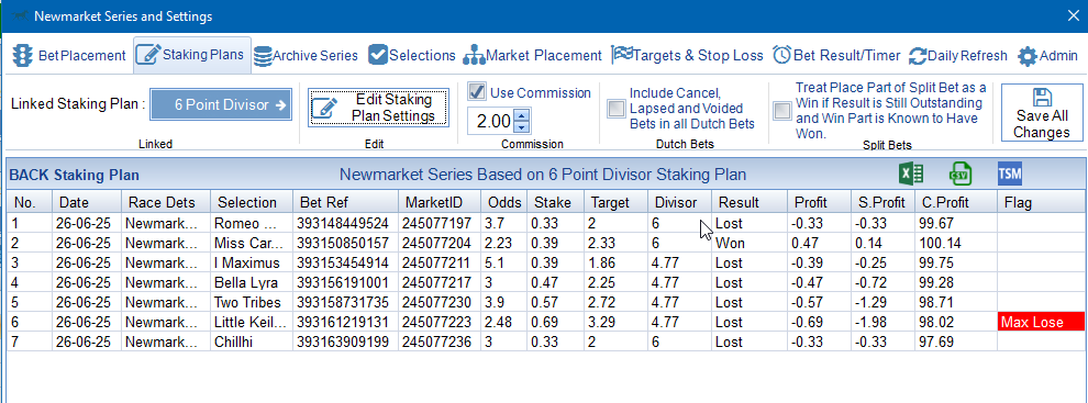 The 6 Point Divisor Staking Plan lends itself to having an inbuilt Target and Stop Loss. For a full description see - https://www.thestakingmachine.com/staking_plans/6-point-divisor/
