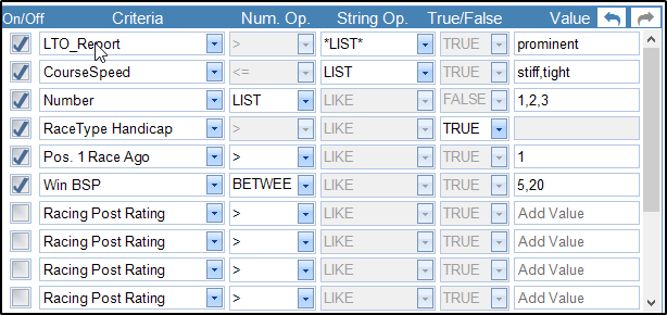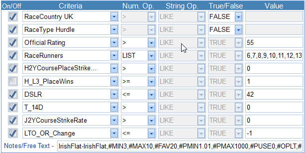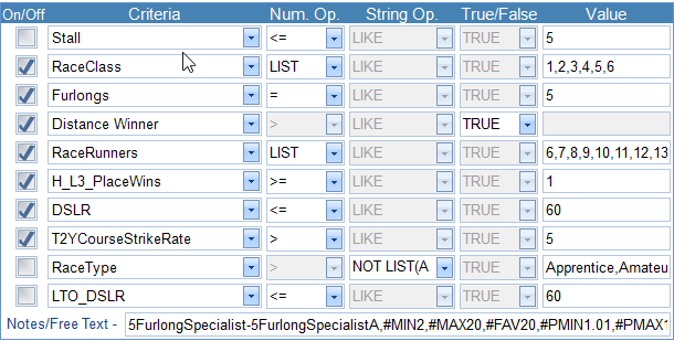 This system looks for an edge in the Place Market. We are looking at Larger fields in the lower Class Races where the horses are generally less predictable. To ensure we have a Horse with a good history we use a Predited Ranking of Less than or Equal to 5 and a Racing Post Rating greater than 60.