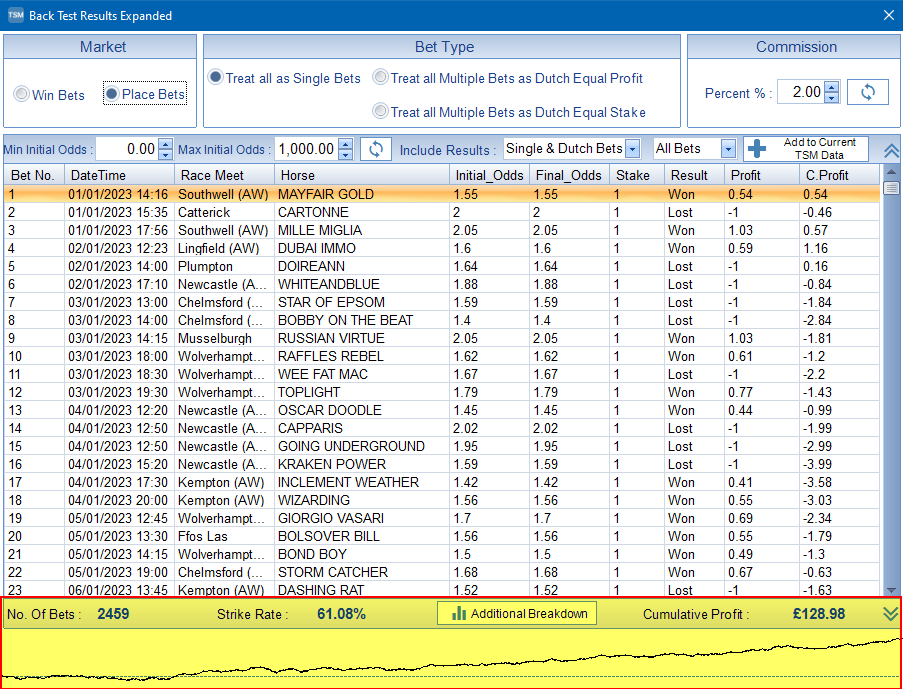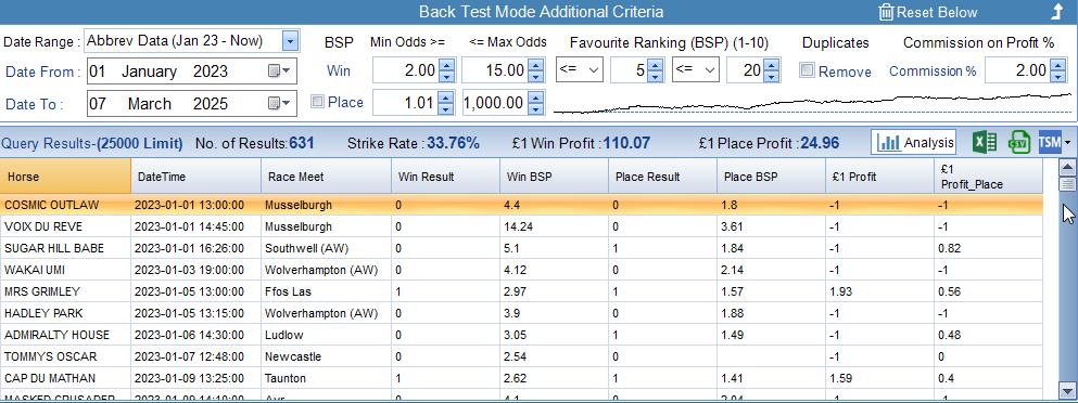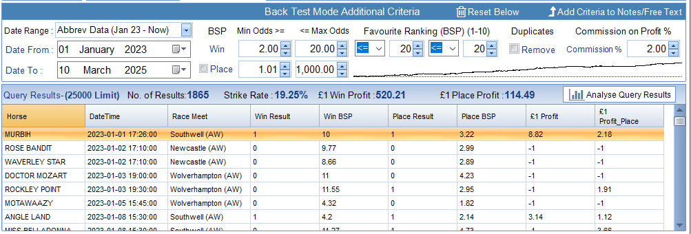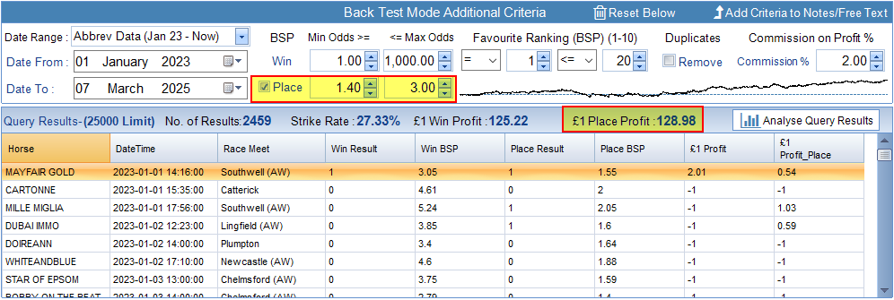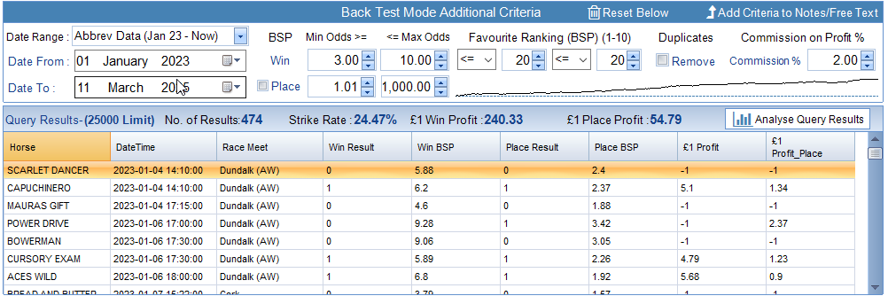 We can see the Places Results and Strike Rate by pressing the Analyse Query Results Button.