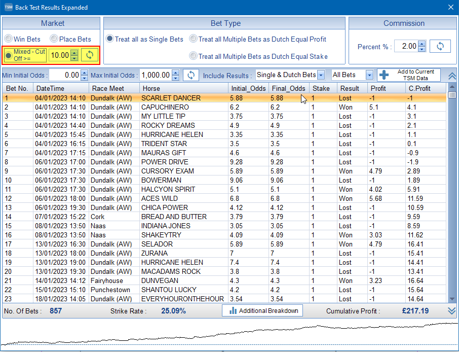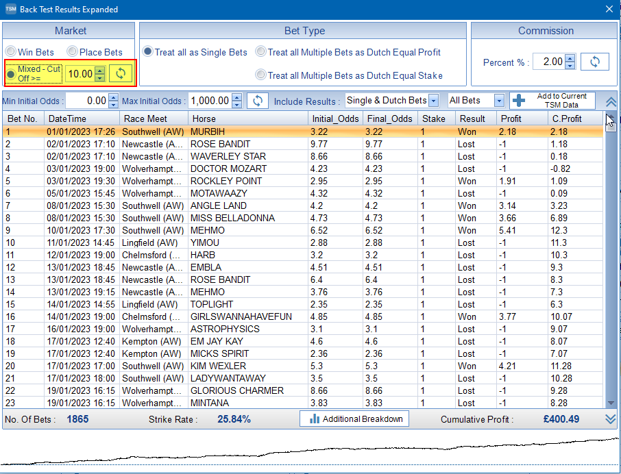 By having a cut off set at 10 so that any selections with Win Odds over 10 are Placed instead, we can get our strike rate at over 25% and profit back up over £200.