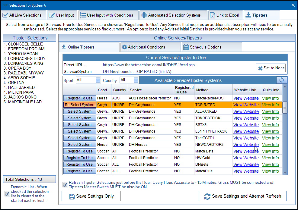 Each selection system can be found via the View Series/Settings –> Selections –> Tipsters for each for each of your individual systems in TBM.