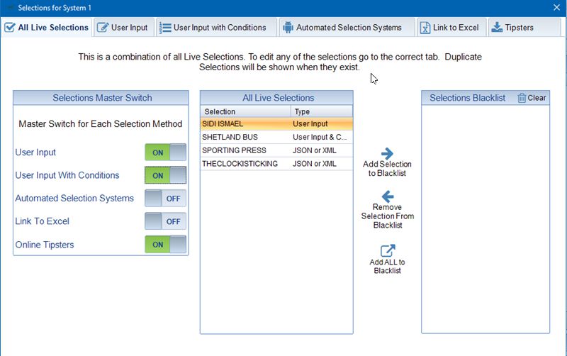 This is the over view screen for your systems selections. In the screenshot below I have switched on User Input, User Input with Conditions and Online Tipsters. This means that any selections added using these methods are now live. All live selections are shown in the 'All Live Selections' Grid.