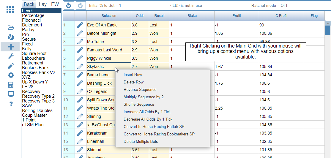 If you want to delete multiple bets in one go it will be much easier to use the Delete Multiple Bets Screen. Access the Main Grid Context Menu by right clicking anywhere over the Main Grid. This will bring up a context menu with various options. The last option is Delete Multiple Bets.