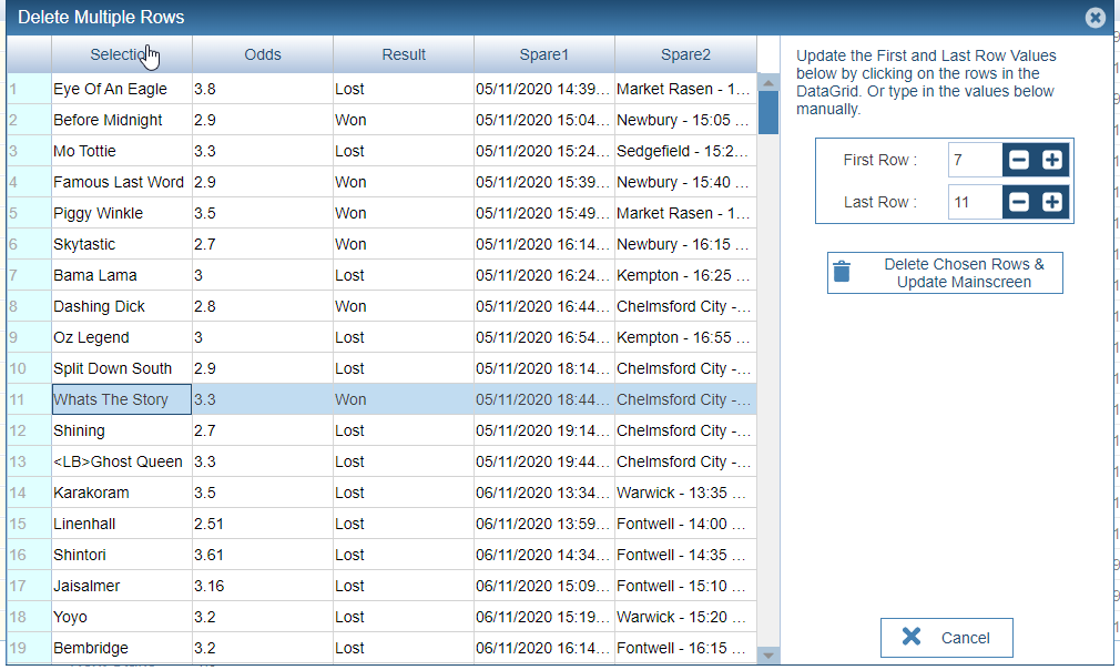 This will bring up the Delete Multiple Bets Screen as below. Click on the rows to set the row number or edit directly the row numbers directly. Once done, press 'Delete Chosen Rows & Update Main screen. The selected rows will then be removed.