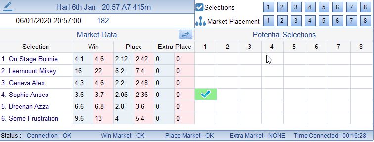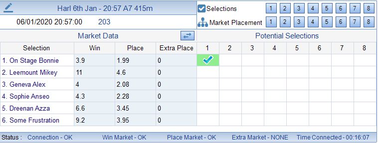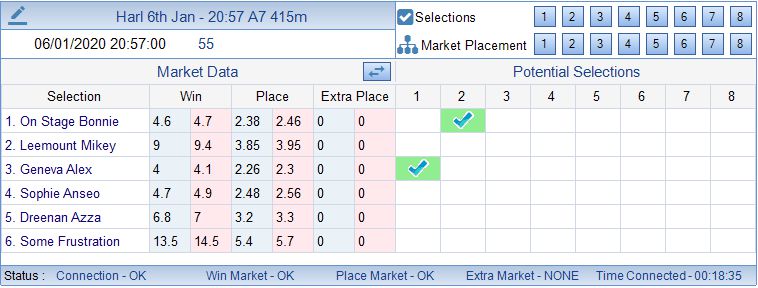 Any selections that are found are highlighted. In all the screen-shots in this topic I have added Geneva Alex as a selection for System 1. It has blue tick which is the default image for a matching selection. The background is Green which means at the the moment it fits my odds criteria. If there was a match but the odds were out of my range or some other criteria wasn't quite met the background would be orange.