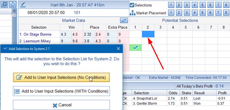 As well as going through Selections Screen to add selections we can also add selections manually by left clicking on the mouse where the system column and horse row meet. For instance in the screenshot below I am going to to add On Stage Bonnie to System 2.