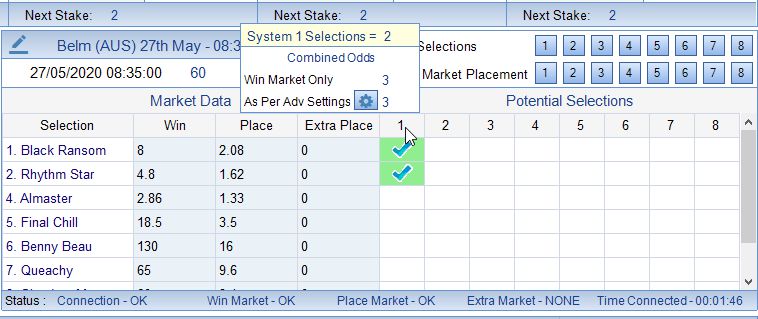 In the screenshot above the pop up is telling us that there are 2 potential selections for System 1 and that their combined odds to profit in the Win Market is 3.