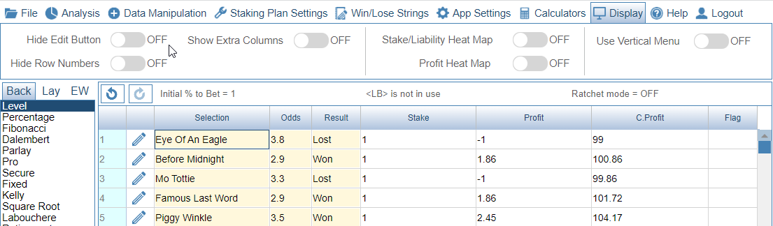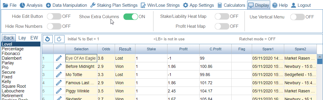 Second image shows Show Extra Columns switched on. You can see the Extra Columns are now visible.