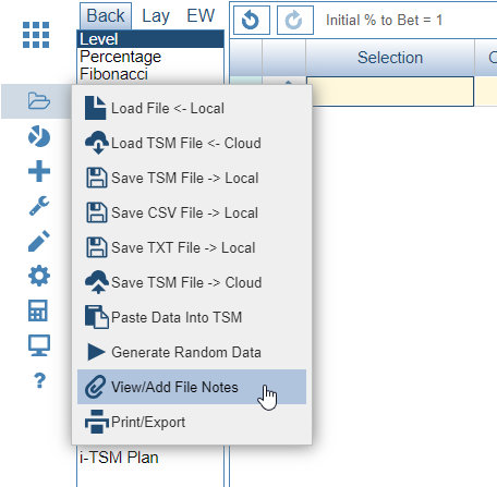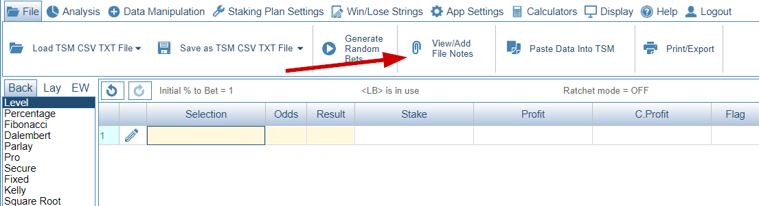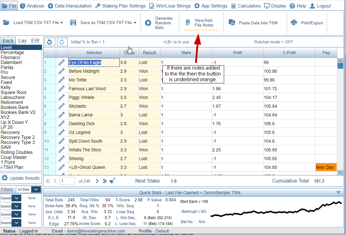 Notes Feature allows you to add specific notes to a TSM file. You can also link a specific set of staking plan settings (Profile) with a TSM file so that every time you open a particular TSM file, the linked profile is also opened. When you load a TSM file which has notes, the Notes Button will be highlighted orange as below.